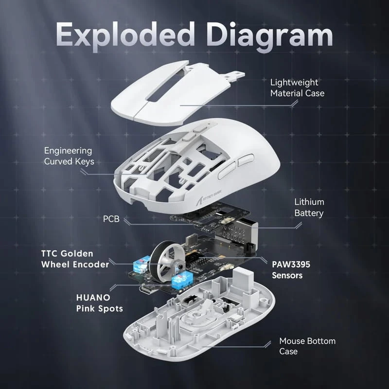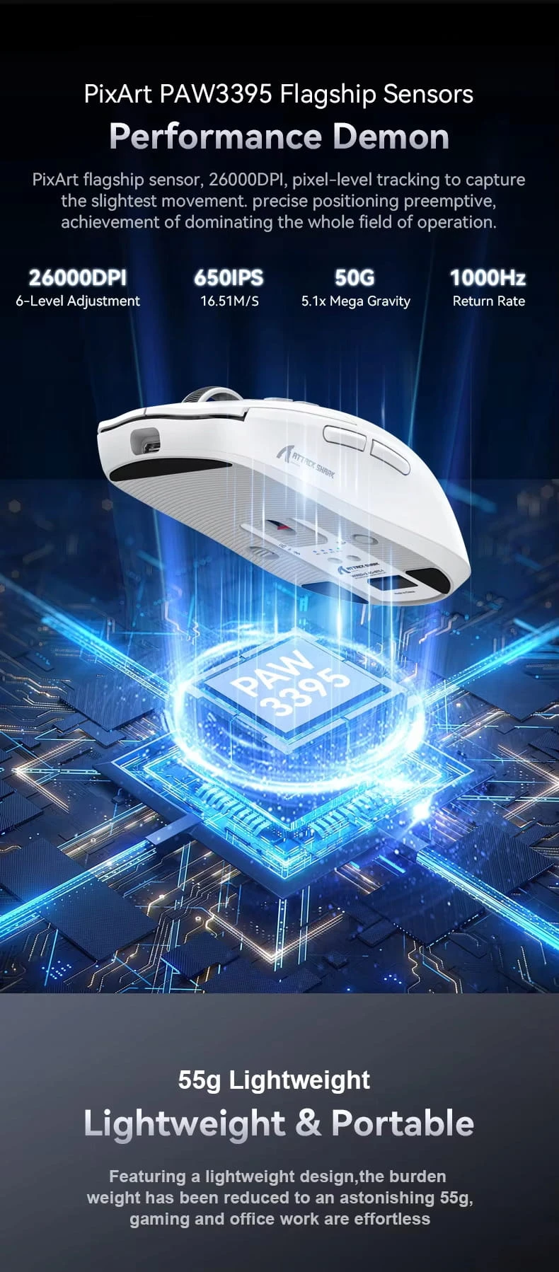 - Sensor: Pixart PAW3395, 26000 DPI, 650 IPS, 50G, 1000Hz