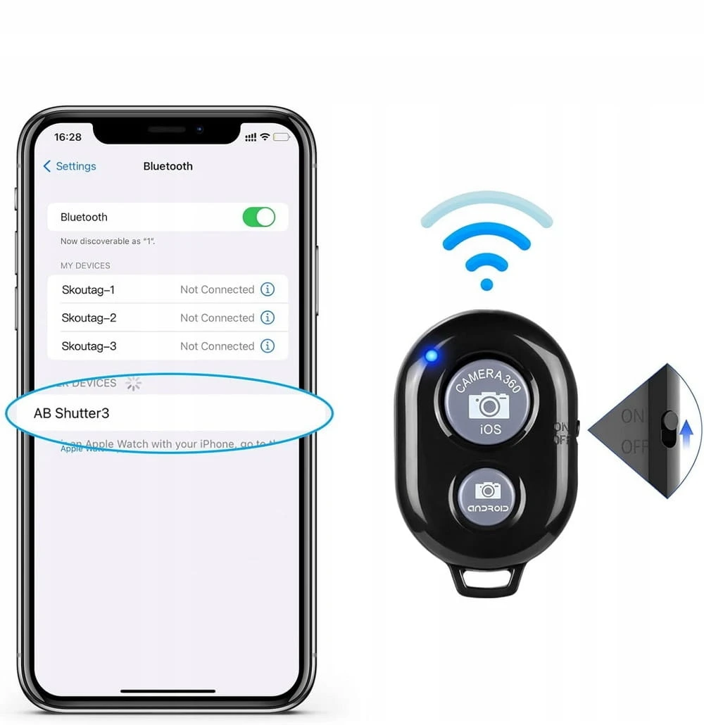 - Łatwe i natychmiastowe parowanie z urządzeniem mobilnym. Wystarczy przesunąć włącznik na napis "ON" aby stał on się wykrywalny dla innych urządzeń (będzie migała niebieska dioda). Parowanie następuje natychmiastowo po wybraniu w menu Bluetooth telefonu urządzenia "AB Shutter"